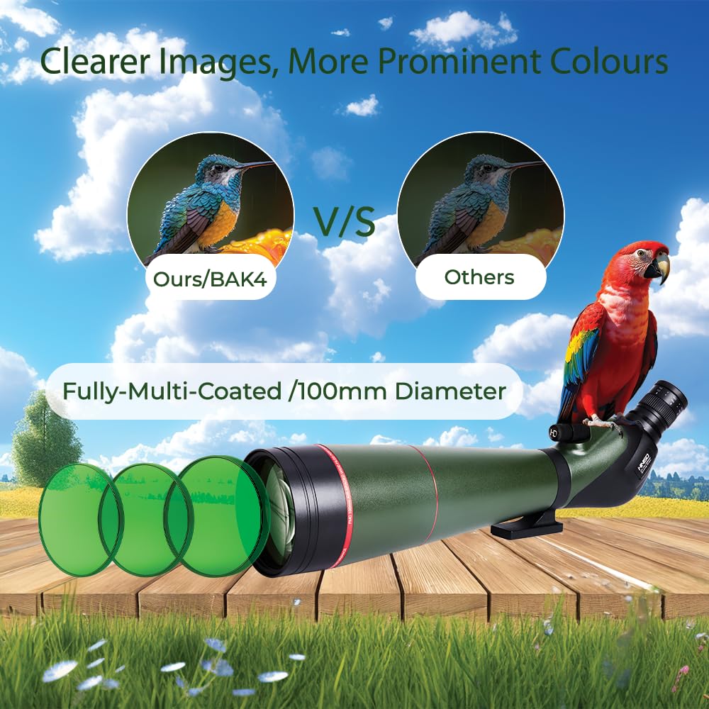 Unlock crystal-clear, long-range viewing with the Hiniso 25-75x100 HD Spotting Scope, engineered for precision, clarity, and rugged outdoor performance. With a wide 100mm objective lens and powerful 25x to 75x zoom, this scope brings distant wildlife, celestial bodies, and targets into sharp focus. The advanced Dual Focus System—featuring both coarse and fine adjustment wheels—lets you dial in effortlessly for detailed, stable views. Premium BAK4 prisms and fully multi-coated optics enhance light transmission for brighter, high-contrast visuals with true-to-life color accuracy. Designed to withstand harsh outdoor elements, the scope features a waterproof, fogproof, and dustproof construction with a nitrogen-filled barrel and O-ring sealing. The complete kit includes a durable tripod for steady hands-free use, a universal phone adapter for capturing stunning photos and videos, and a padded carry case for convenient travel and protection. Backed by a 2-year warranty and reliable customer support, the Hiniso 100mm spotting scope is perfect for bird watchers, stargazers, target shooters, and nature enthusiasts who demand performance, portability, and peace of mind.